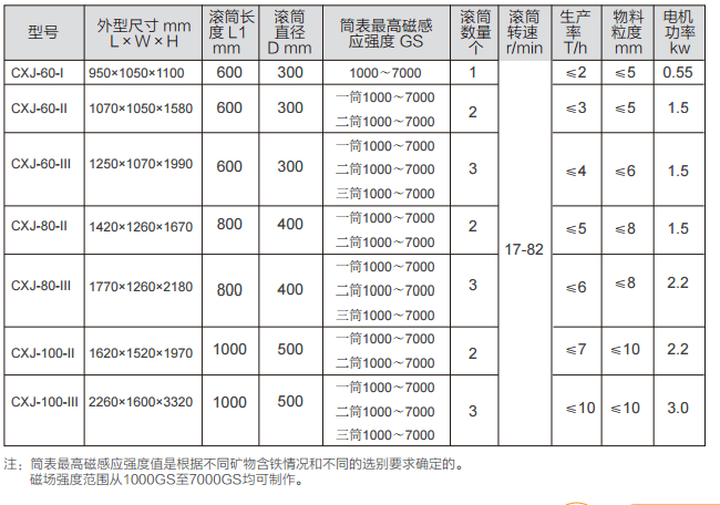 CXJ型筒式自動磁分離機(從單筒到三筒)是一種從干性粉料中連續自動除鐵的磁選設備,其內部采用獨特的磁路設計,由高性能永磁王釹鐵硼材料作為磁源,磁場強、吸力大、除鐵率高,入料方式采用我公司特有的勻速振動給料裝置,入料均勻,更利于進入磁選區后的分離。具有免維護、節約能源、使用安全可靠等特點,可調整控制進料量,適用于不同顆粒的要求。產品廣泛應用于磨料磨具、耐火材料、非金屬選礦、碳黑、糧食、飼料、化工原料等行業。