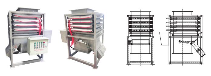 CQZ型全自動在線磁分離機安裝于流水線中以實現(xiàn)在線實時自動清除物料中的鐵質(zhì)。自動定時控制器可以設定為連續(xù)自動實時清理,也可根據(jù)鐵質(zhì)含量情況來設置清理時間間隔。其強大的磁場可以清除流動、干燥的、流動性好、粉狀的、細小顆粒中的鐵磁性物質(zhì)。二、示意圖