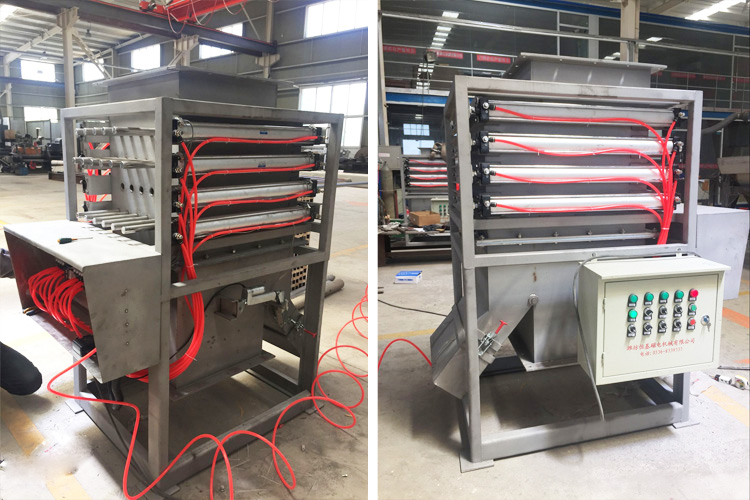 CQZ型全自動在線磁分離機主要用于分離粉狀物料中的鐵磁性雜質(zhì),由至少四層磁棒錯層排列,因此確保物料在下落過程中可以與磁鐵充分接觸。至少四層抽屜式的磁棒組,可以設定為連續(xù)不斷的交替卸鐵,當其中一層被抽取卸鐵時,另外三層仍能確保正在下落的鐵質(zhì)被吸附。