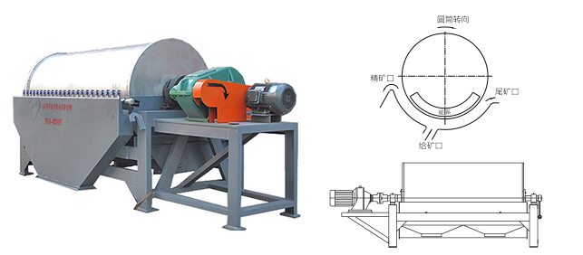 其原理是當礦漿進入磁場區時,其中強磁性礦物被吸附在圓筒表面,弱磁性和非磁性礦物被水流沖洗排出,而吸附在圓筒表面上的磁性礦物隨圓筒旋轉,被帶出磁場區,用沖洗水沖入精礦槽中,完成分選作業。
