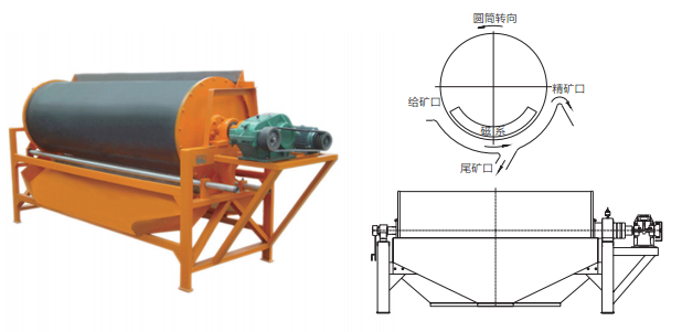 CTS型濕法順流式磁分離機適用于濕式選別礦石粒度為6~0mm的較粗粒度強磁性物料的預選和精選,或者除去非磁性礦物中混雜的強磁性礦物。本機可以連續給礦和排礦,磁場強度大,磁場梯度高,工作間隙大,具有較高的處理能力。亦可多臺串連工作。其原理是當礦漿進入磁場區時,其中強磁性礦物被吸附在圓筒表面,弱磁性和非磁性礦物被水流沖洗排出,而吸附在圓筒表面上的磁性礦物隨圓筒旋轉,被帶出磁場區,用沖洗水沖入精礦槽中,完成分選作業。